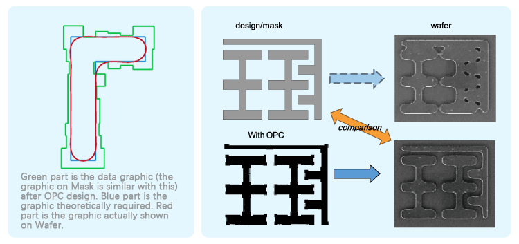 Optical proximity correction(OPC),is a kind of technology using the special compensation design of graphics to enhance the exposure graphics quality and lower or offset the influence of diffraction proximity effect on the graphics generation process